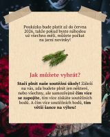 - Do soutěže se musíte registrovat – stačí vyplnit formulář, který máme na webu. Pak už stačí splnit jediný úkol a jste zařazeni. (Registrační formulář potřebujeme, abychom vám mohli připočítávat body a kontaktovat vás v případě výhry. Pokud jste ho zapomněli vyplnit, můžete tak učinit až do 24. prosince 2025.) U každého úkolu vám to připomeneme!