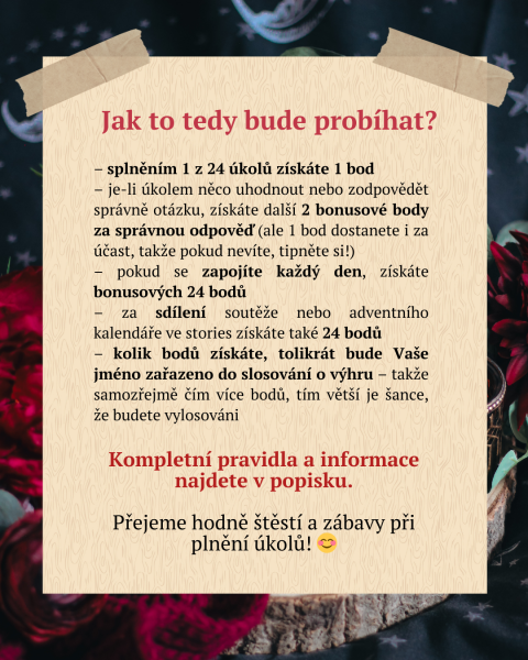 Už třetím rokem jsme si pro vás připravili soutěžní adventní kalendář – 24 úkolů zahrnující hádanky, úkoly i vědomostní otázky! 🎄 A na tři z vás opět čeká poukázka v hodnotě 2 000 Kč na nákup na našem e-shopu. 😊