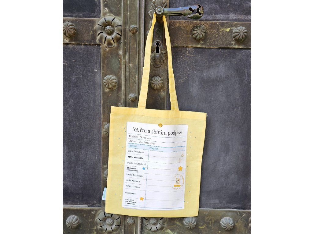 Festivalová taška s motivem YA čtu conu 2026. Z jedné strany je logo festivalu, z druhé strany je podpisový arch, na který si můžete během autogramiády nasbírat podpisy od autorů (třeba pokud s sebou nechcete nosit knihy, nebo chcete mít speciální památku na letošní ročník).